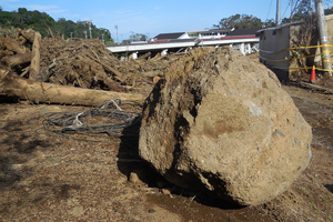 土石流で流されてきた幅2mの石、後ろは元の小学校舎