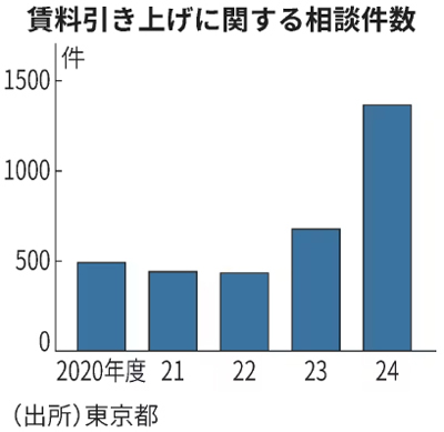 都は賃料値上げの消費者相談が23年度の677件から24年度は1366件と約2倍に増えていると発表している。東京では富裕層しか住み続けられないとの声が上がっている。